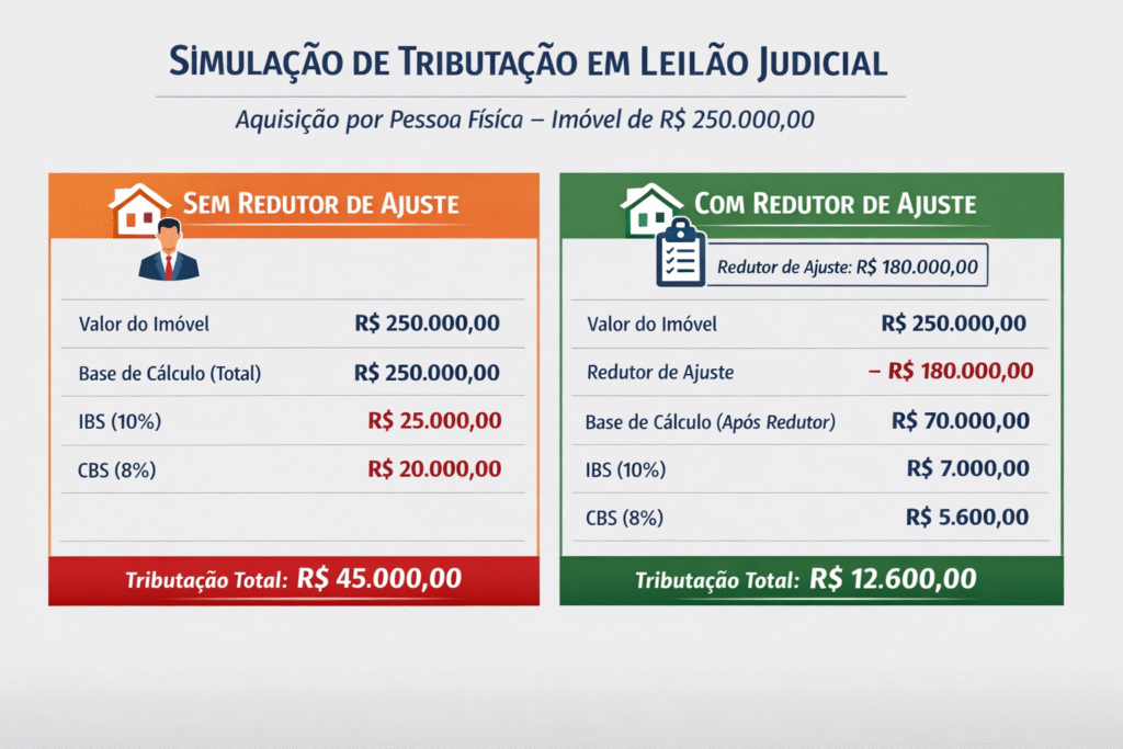 Segundo projeções divulgadas pelo Valor Econômico, a alíquota total estimada do IBS/CBS pode alcançar 28,7%. Após a aplicação dos redutores legais de alíquota e do redutor de ajuste da base de cálculo, a carga efetiva em operações de leilão pode girar em torno de 14% sobre o valor da arrematação.